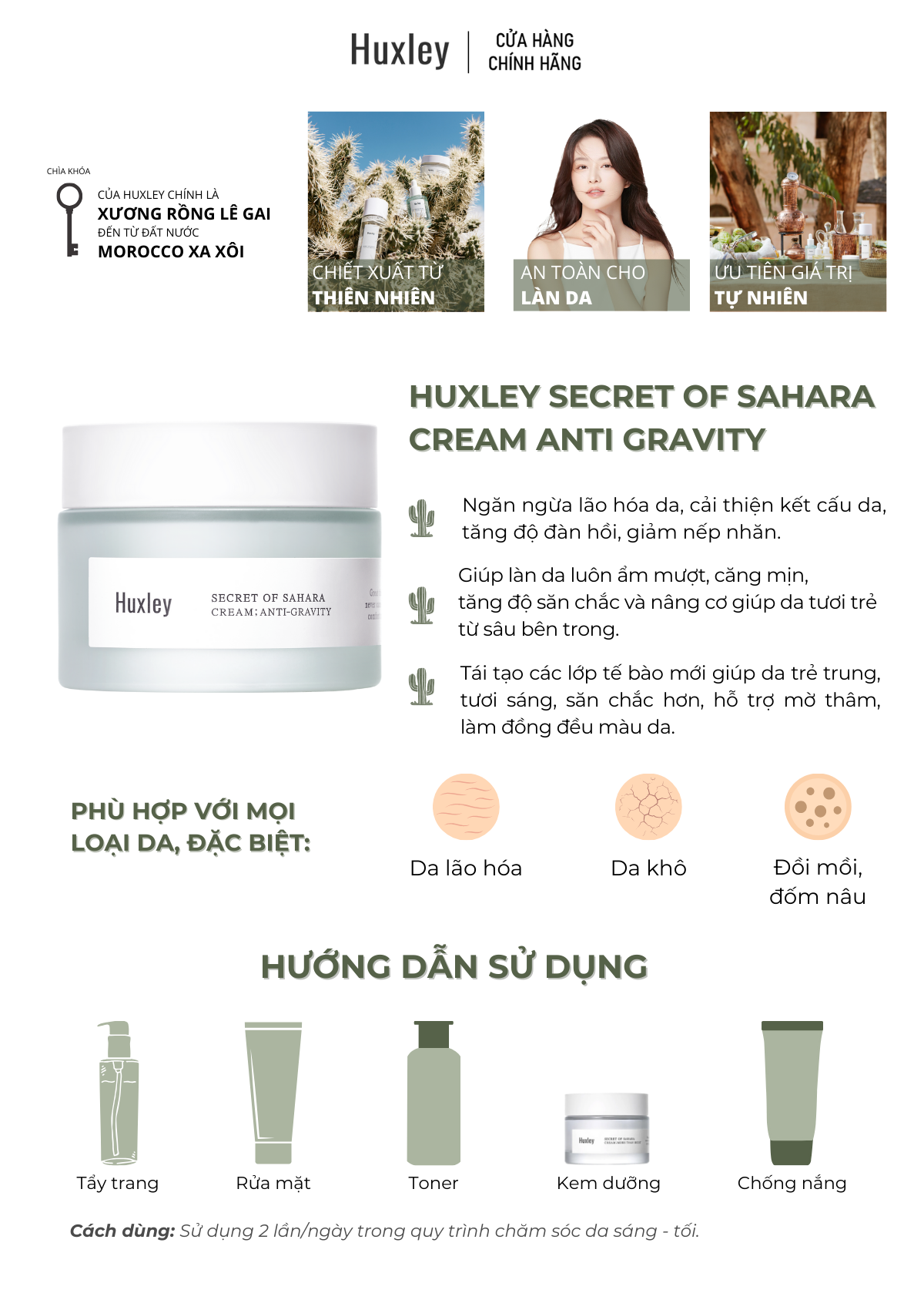 - Kem Dưỡng Ẩm Chống Lão Hoá Huxley Cream Anti Gravity: Phù hợp với mọi loại da, đặc biệt là da thiếu ẩm và da có dấu hiệu lão hóa.